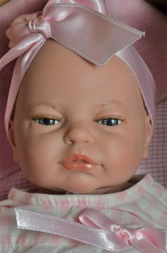 Novorozená holčička Bedřiška je krásné realistické miminko značky Magic Baby, které bylo vyrobeno ve Španělsku firmou Lamagik. Miminko je dlouhé 39 cm. Celé tělíčko je vyrobené z vinylu a propracované do všech detailů i těch, které dělají holčičku holčičkou. Má modré oči, nalepené řasy a nemá vlásky. Je oblečená do růžovobílého letního overálku. Na hlavičce má růžovou mašli. K miminku patří látkový spací pytel a gumový zajíček.