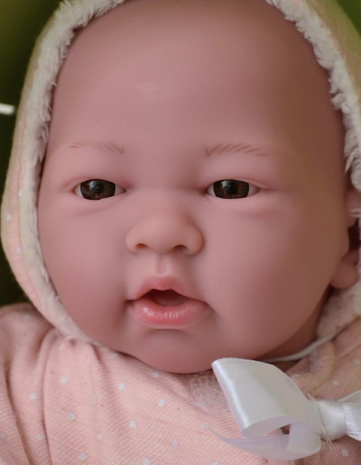 Krásné realistické miminko - holčička Elenka, která je vyrobena firmou Berenguer ze Španělska. Je dlouhá 38 cm. Celé tělíčko je vyrobeno z vinylu a propracováno do všech detailů, je znázorněno i pohlaví. Holčička je oblečená v pěkném růžovém oblečku. Patří k ní plyšová hračka, lahvička, dudlík a kousátko.