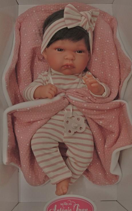 Krásné realistické miminko jako živé od španělské firmy Antonio Juan, holčička Toneta je 33 cm vysoká, vyrobená z měkčeného vinylu, který je velmi příjemný na dotek. Tělíčko je precizně propracováno do všech detailů, včetně pohlaví. Panenka má černé kratší vlasy. Holčička Toneta je oblečená do růžovo bílého pruhovaného trička a kalhot. Na hlavě má uvázanou čelenku také za stejné proužkované látky. Na nohách má růžové ponožky. Miminko leží na růžovo-bílé dečce, která je stejně jako dudlík součástí balení.
