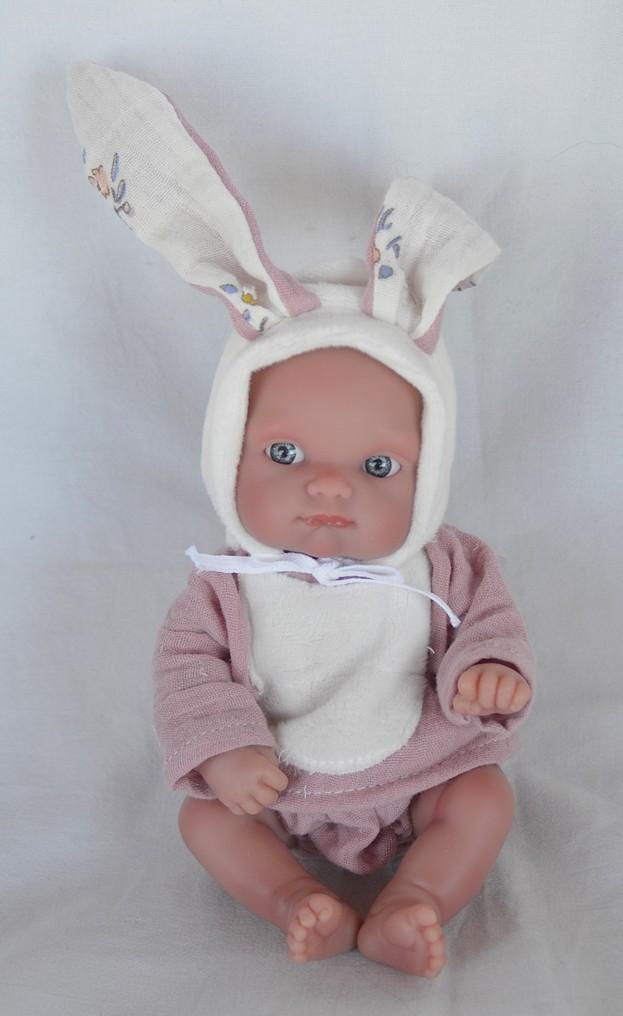 Panenka je oblečená do roztomilého kostýmku zajíčka, který jí dodává veselý a hravý vzhled.