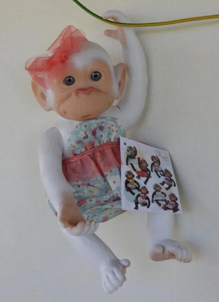 Krásná bílá opička je 25 cm vysoká, je vyrobena z vinylu. Stejně jako běžné panenky má 5 kloubů - lze polohovat nohy, ruce a otáčet hlavou. Opička sama sedí, ale nedokáže sama stát. Může se ale například zavěsit na prádelní šňůru. Opička má modré nemrkací oči. Opička může být podle oblečení holčičkou i klukem. pohlaví není znázorněno. Opička je oblečená do krátkých modrých kalhotek s laclem a světlým potiskem, ozdobených červenou krajkou z tylu. Na hlavě má červenou mašli z tylu.