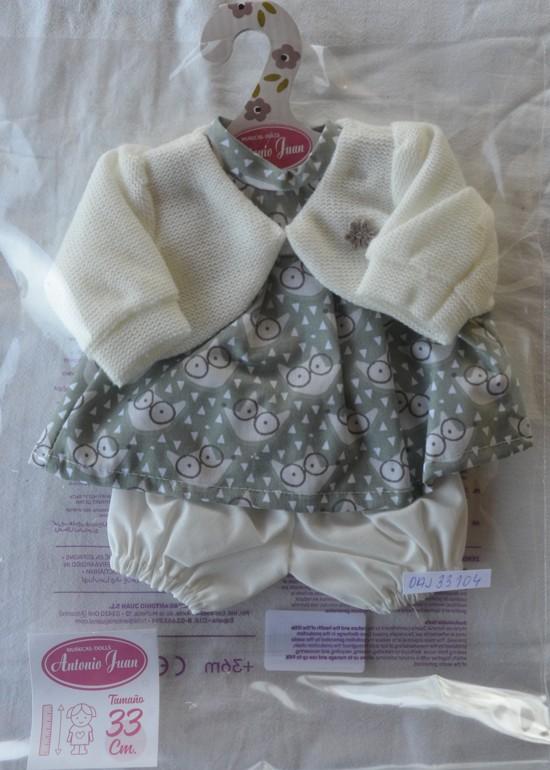 Obleček se skládá ze zelených šatiček, na kterých jsou krémové sovičky, krémového pleteného svetříku a bílých spodních kalhotek