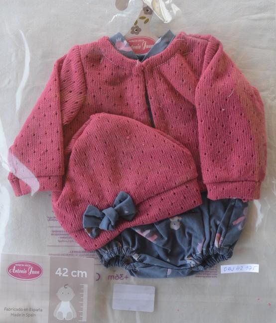 Obleček se skládá z tmavě modrého overálku s barevným potiskem a červeného dírkatého svetru a čepičky s mašličkou.