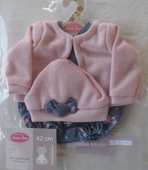 Obleček se skládá z tmavě modrého overálku s barevným potiskem a světle růžového pleteného svetru a čepičky s mašličkou.