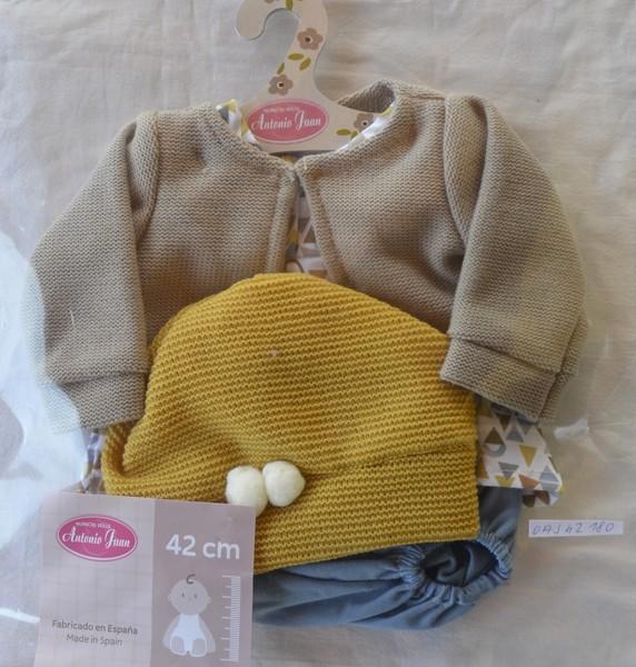 Obleček se skládá z bílé haleny s trojúhelníčkovým potiskem, modrých kalhotek, světle hnědého pleteného svetříku a žluté pletené čepičky se 2 bambulkami.
