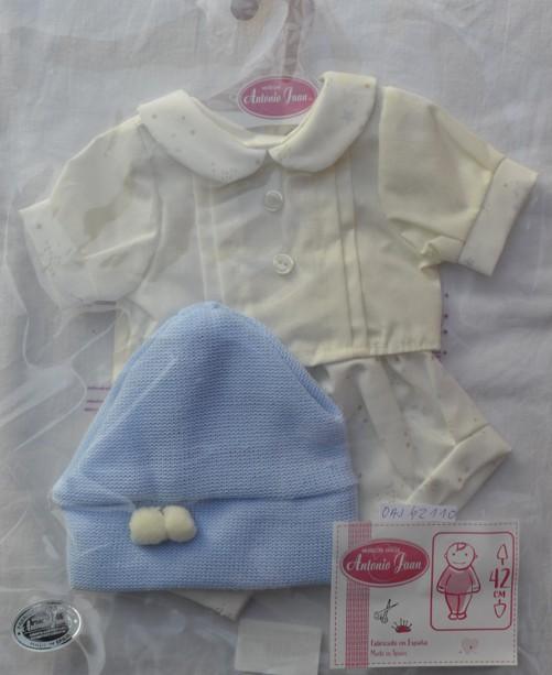 Obleček se skládá z bílé košilky s krátkými rukávy a límečkem a manžetami s drobným světlým potiskem, ze stejně potištěné látky jsou i krátké kalhoty, které patří k oblečku. Poslední částí je modrá pletená čepička zdobené dvěmi bílými bambulkami.