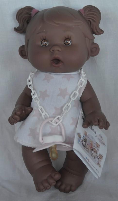 Trošku překvapená snědá holčička Holy z kolekce Nenotes je vyrobena ve Španělsku firmou Marina & Pau. Má celé tělíčko z vinylu, hezky vypracované včetně pohlaví. Je 26 cm vysoká, nemá vlásky, jen vymodelované z vinylu a to i dva culíčky. Má modré nemrkací oči. Nevydává žádné zvuky. Má dudlík, který jí do pusinky nejde, je pouze dekorativní.