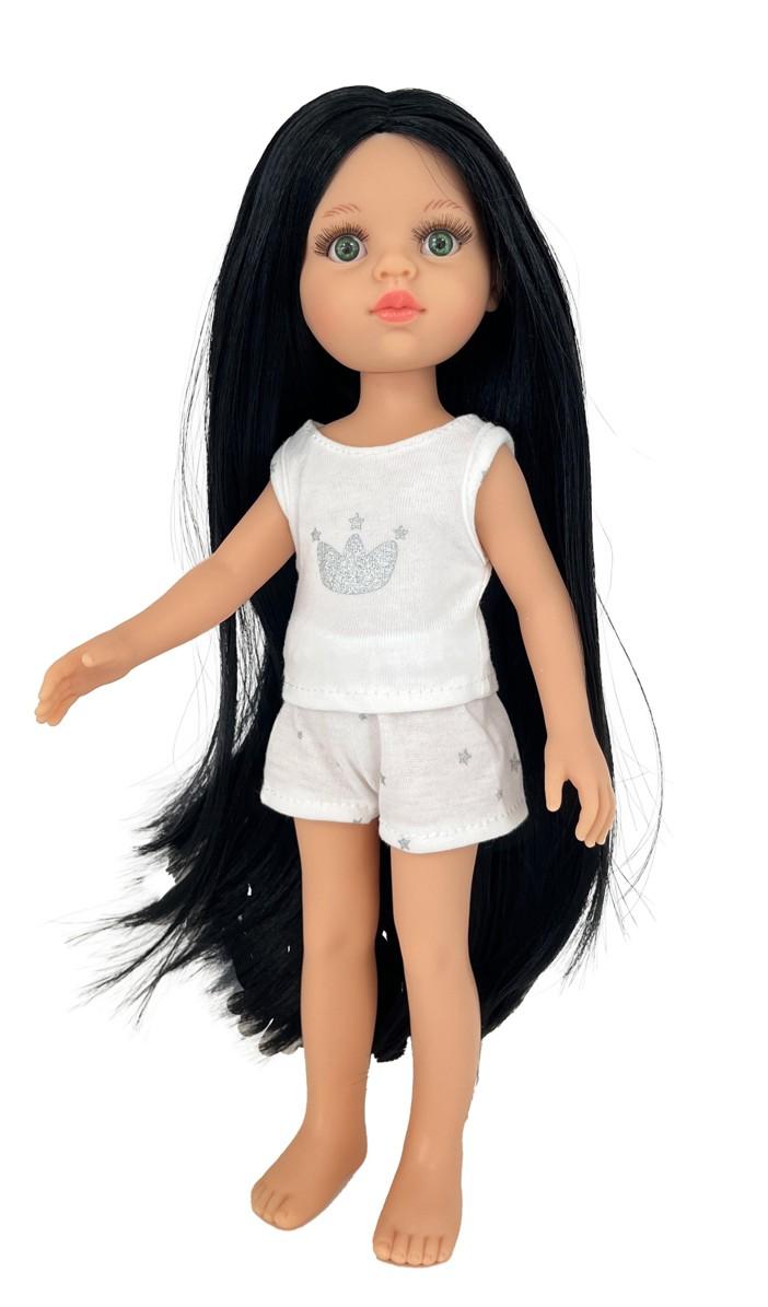 Panenka Carina v pyžamu je krásná realistická panenka od španělské firmy Paola Reina, je 32 cm vysoká, vyrobená z kvalitního vinylu a voní po vanilce. Panenka má velmi dlouhé černé vlasy a zelené oči. Je oblečená stejně jako všechny panenky této řady (Las Amigas pijamas) do pyžamového trička a kraťasů.