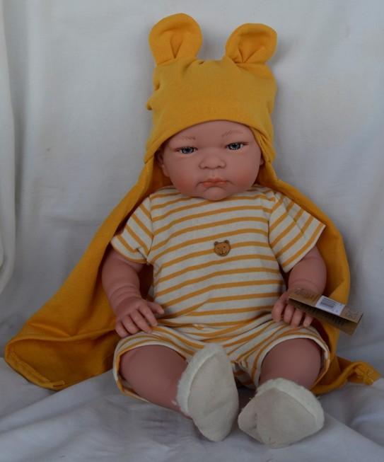 Realistické miminko v pruhovaném oblečku je chlapeček John - realistické miminko značky Magic Baby, které bylo vyrobeno ve Španělsku firmou Lamagik. Miminko je dlouhé 42 cm. Celé tělíčko je vyrobené z vinylu a propracované do všech detailů i těch, které dělají chlapečka chlapečkem. Má nemrkací modré oči, nalepené řasy a nemá vlásky. Je oblečený do žluto-bílého pruhovaného overalu, který se zapíná vzadu na suchý zip. Na nohách má huňaté pantofle a na hlavě žlutou medvídkovskou čepici s oušky a se závojem.