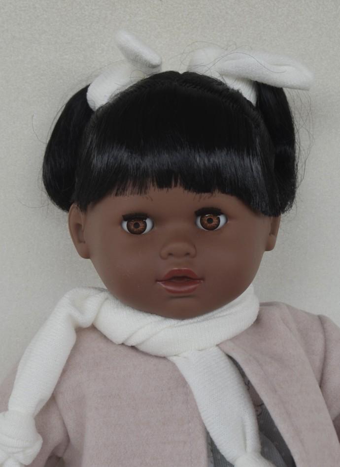 Snědá realistická panenka- Tina s bílou šálou kolem krku od španělské firmy Marina & Pau
