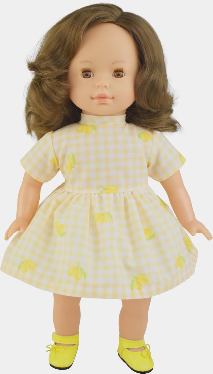 Realistická panenka Virgi z kategorie Blanditas je krásná mrkací panenka od firmy Paola Reina ze Španělska. Virgi je 36 cm vysoká, má měkké-látkové tělíčko a ručičky, nožičky a hlavičku z vinylu. Má krásné, středně dlouhé hnědé vlasy a hnědé mrkací oči. Je oblečená do letních, kostičkových žluto-bílých šatů s obrázky citrónu. Panenka je obutá do nízkých žlutých botiček se zapínáním na přezku.